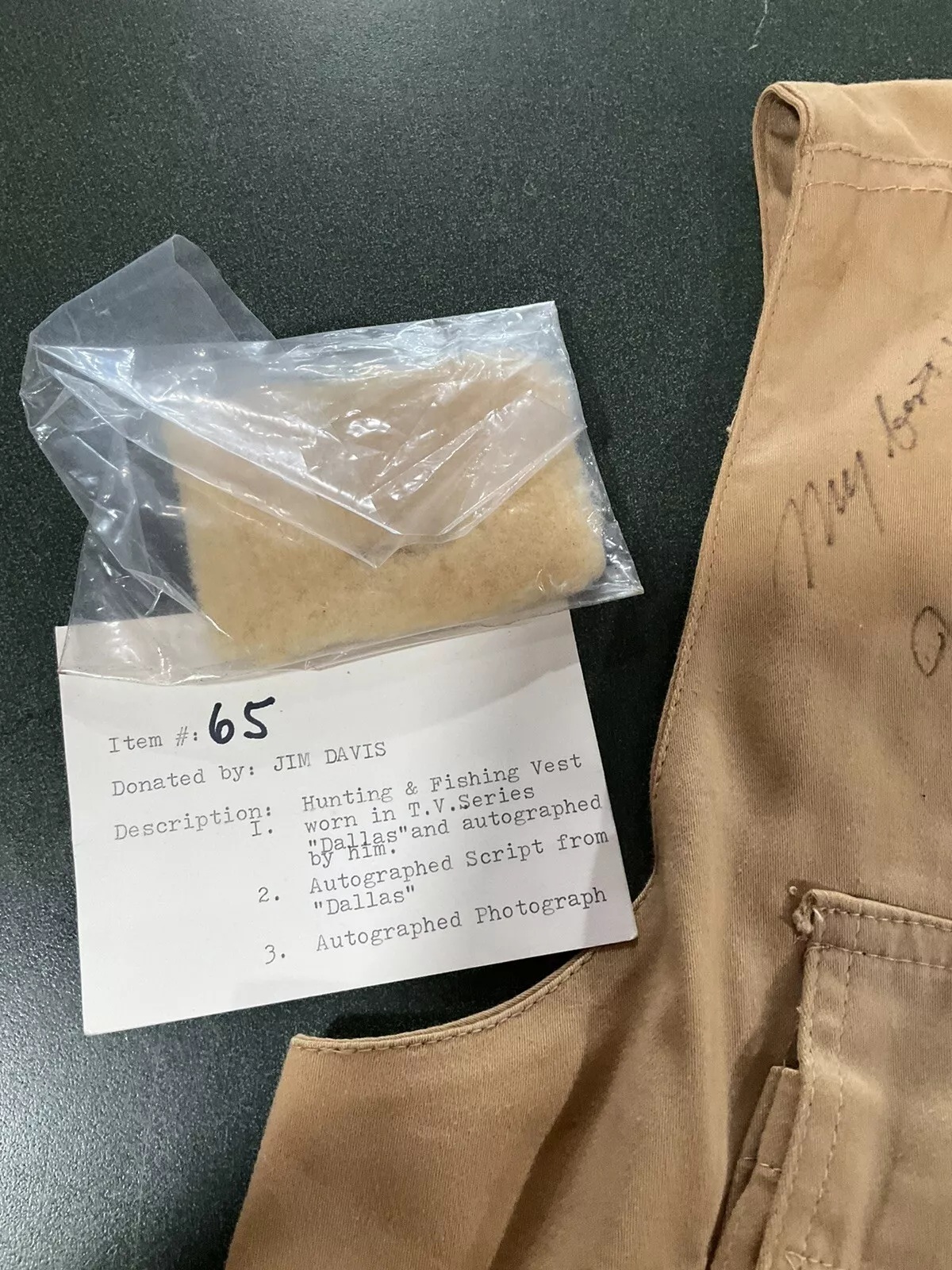 Jim donated this fishing vest to charity. He wore it in the series Dallas and also signed it.